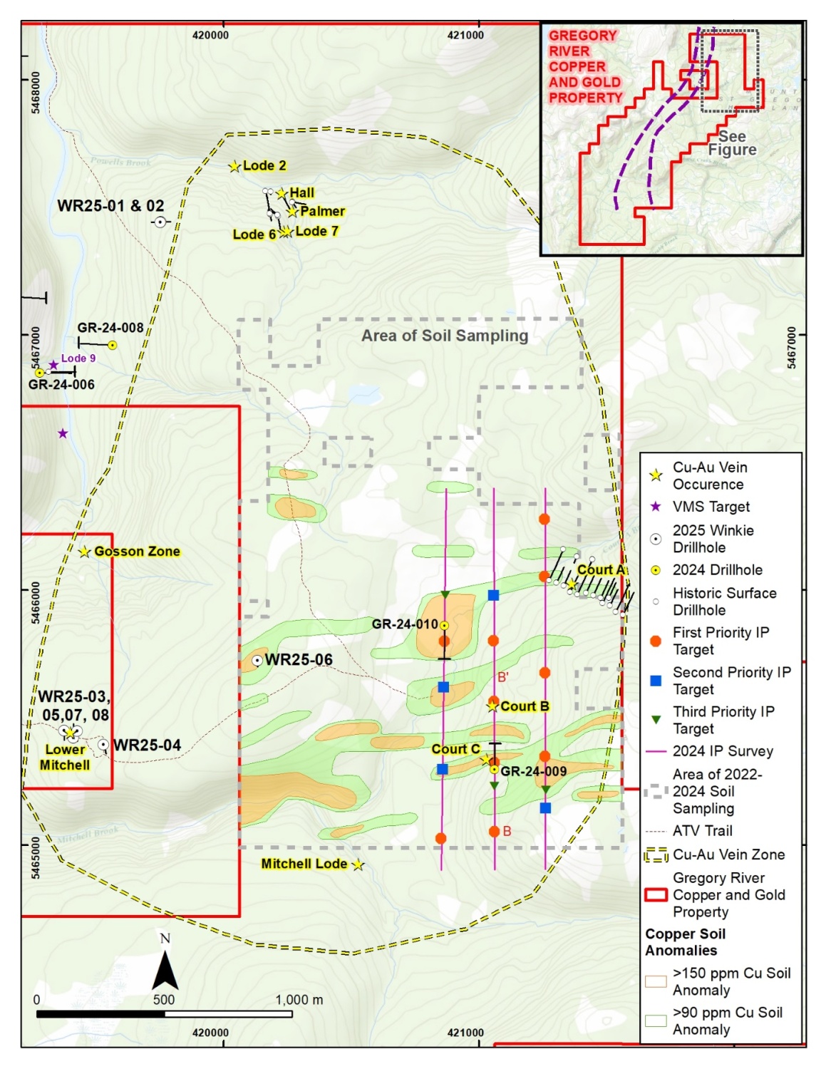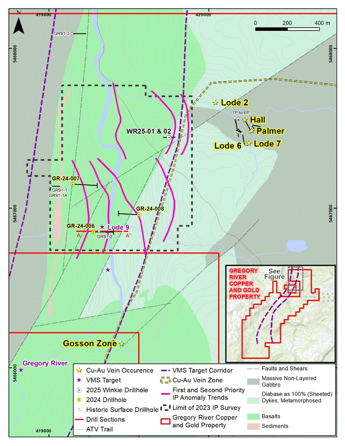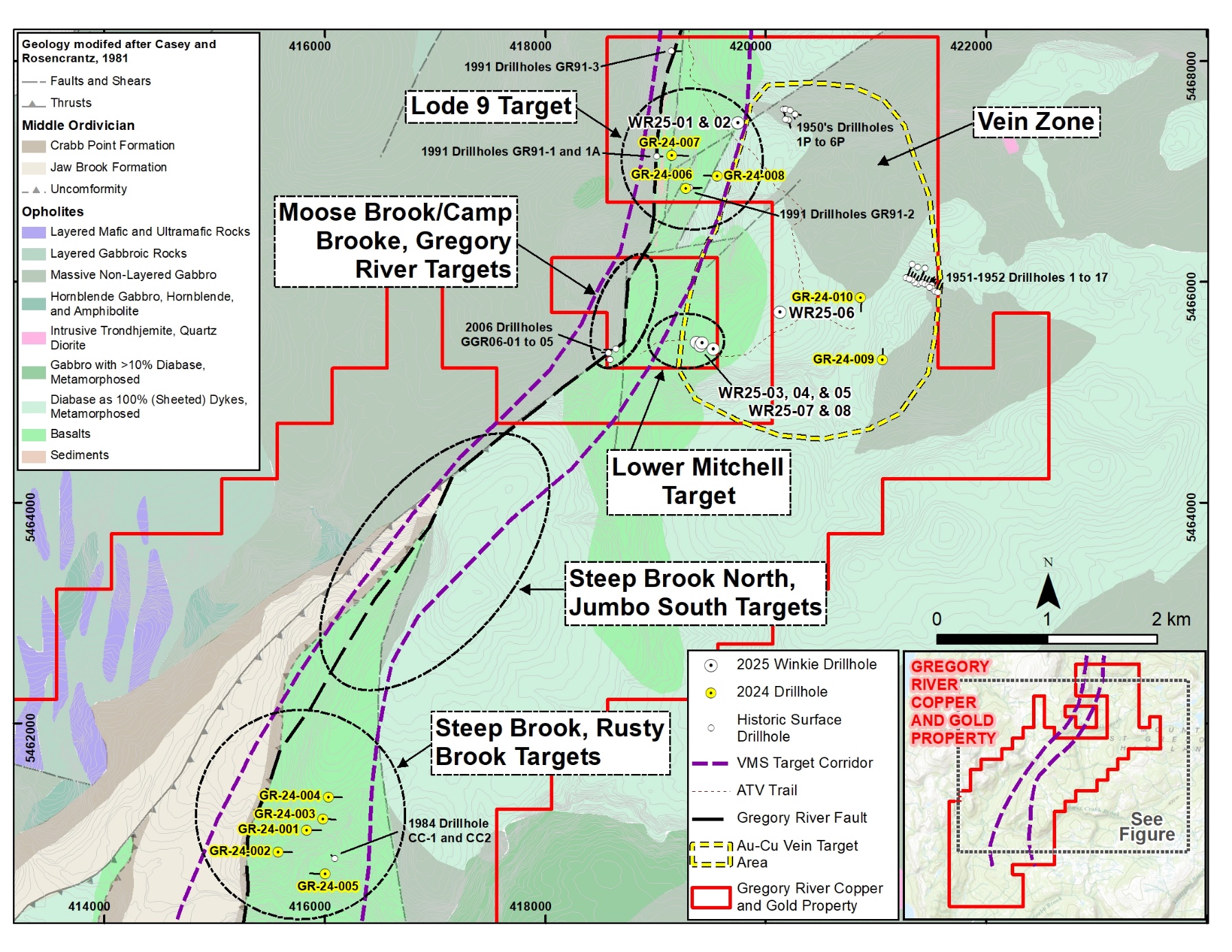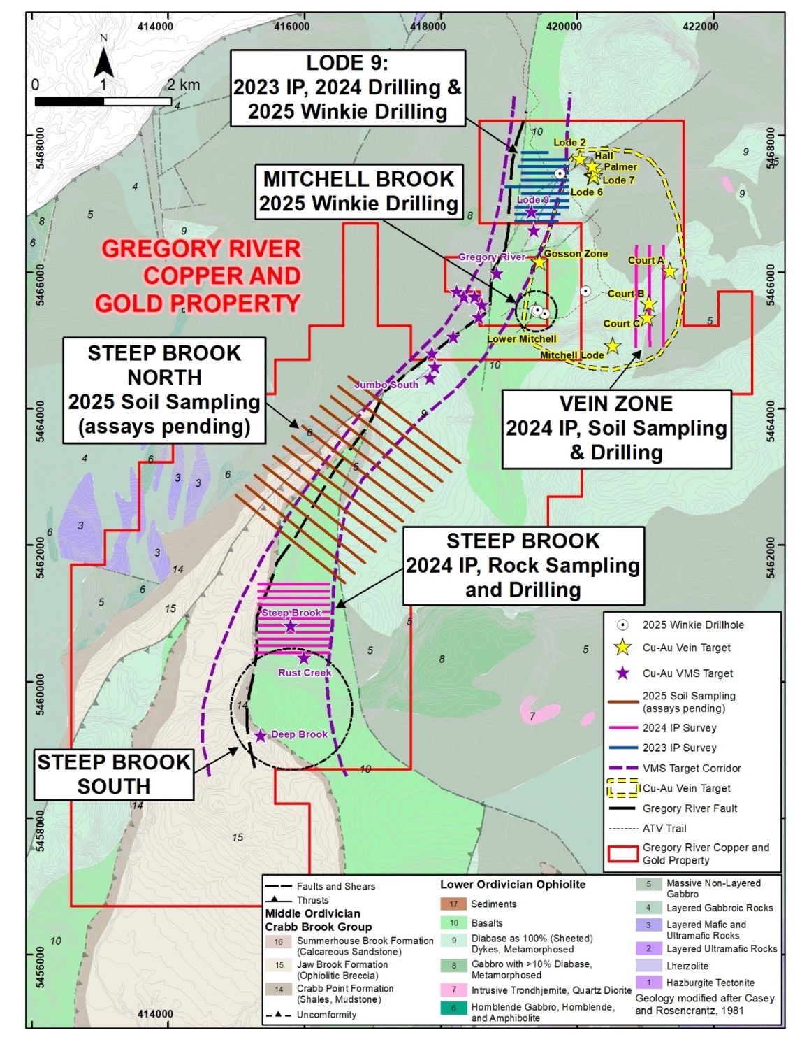 The Gregory River VMS Target Corridor represents an approximately 11-kilometre-long, underexplored trend characterized by Cyprus-type VMS targets, with eight historical drill holes reaching target depth. Cyprus-type VMS deposits in Canada typically average more than 3% copper and around 2.5 g/t gold. Within the corridor, multiple VMS targets have been identified, including Lode 9, Steep Brook, Camp Brook/Moose Brook, Gregory River, Jumbo South, and Deep Brook. Historical and recent surface sampling has returned high-grade results averaging approximately 1.75% copper and 0.76 g/t gold, with assays reaching up to 19.6% copper and 27.4 g/t gold. During the 2024 exploration program, induced polarization (IP) surveys and diamond drilling were completed at Steep Brook and Lode 9, resulting in the discovery of new mineralized zones. In 2025, Winkie drilling led to the discovery of new copper mineralization at Lode 9 Northeast.