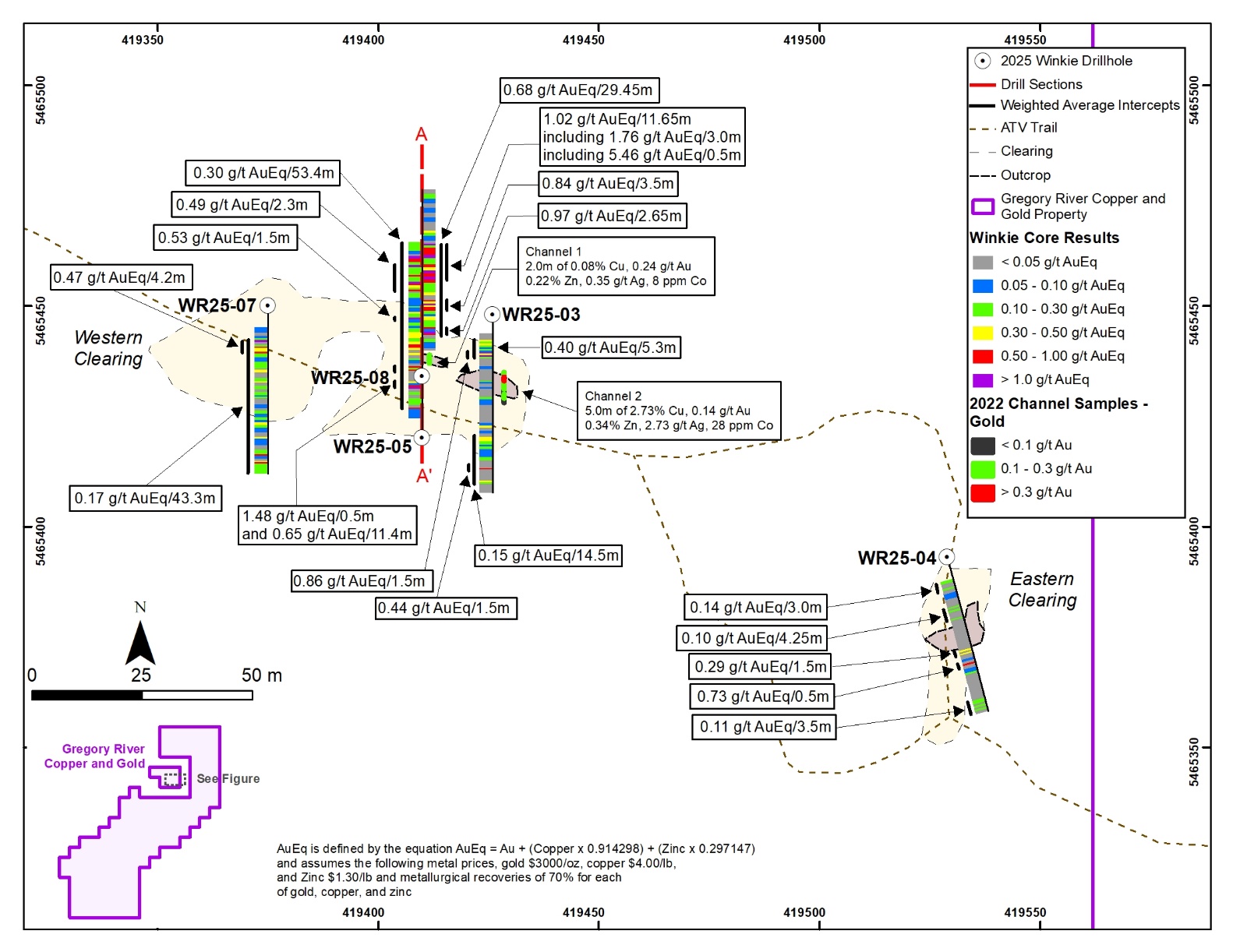First-pass Winkie drilling tested several near-surface, ATV-accessible targets, returning significant results from seven of the eight holes completed. Drilling at Lower Mitchell intersected multiple gold, copper, and zinc zones across much wider intervals than previously indicated by surface work. A new zone of copper mineralization was also discovered at Lode 9 Northeast, located approximately 750 metres from the Lode 9 prospect. The true dimensions and potential grades of these early-stage prospects remain to be determined through additional drilling.