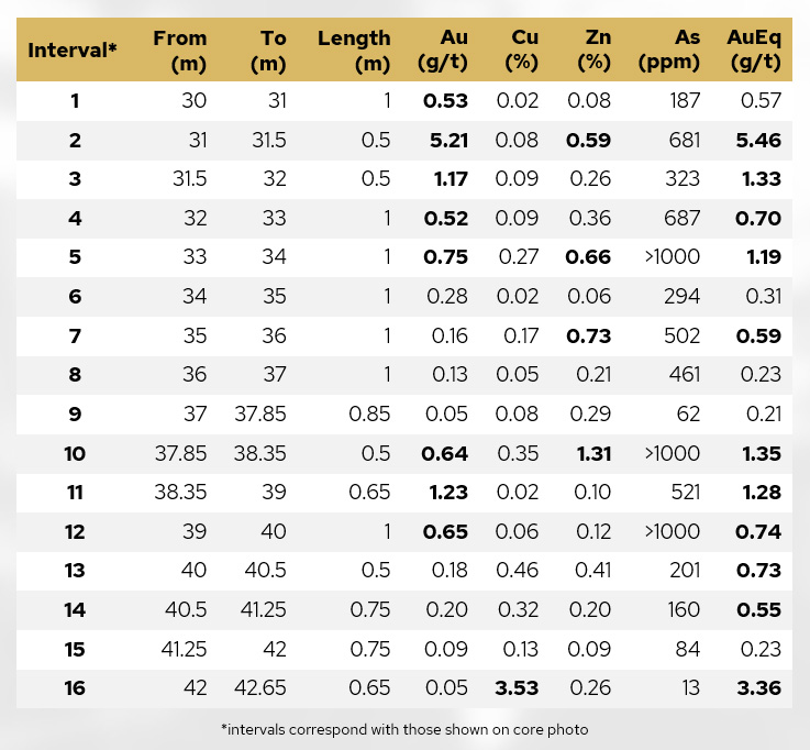 The area hosts a cluster of east-trending, high-grade quartz-carbonate-sulphide veins. These veins typically range from approximately 0.5 m to 2 m in width, locally expanding up to 5 m to 6 m, and contain fracture-hosted and semi-massive to massive sulphides with copper content ranging from about 1% to 25%, averaging roughly 2% to 6%. Historical sampling did not consistently test for gold or other metals, but recent surface sampling indicates potential gold values between 0.1 g/t and 3 g/t. The Court A vein was historically tested by 17 shallow core holes drilled in the 1950s, tracing the vein approximately 340 m northwest, down to vertical depths of around 50 m, with veins remaining open in all directions. Historical drillhole sampling was limited to only the highest-grade portions of the veins (two or three assays per hole), leaving much of the surrounding host rock unsampled. Potential exists for wider mineralized haloes surrounding the main veins and for discovering new veins hidden below surface soil and till cover. To test this concept, Golden Spike completed soil sampling, rock sampling, IP, and two diamond drill holes. Selected historical down-hole intercepts at Court A include (note: gold was not analysed):