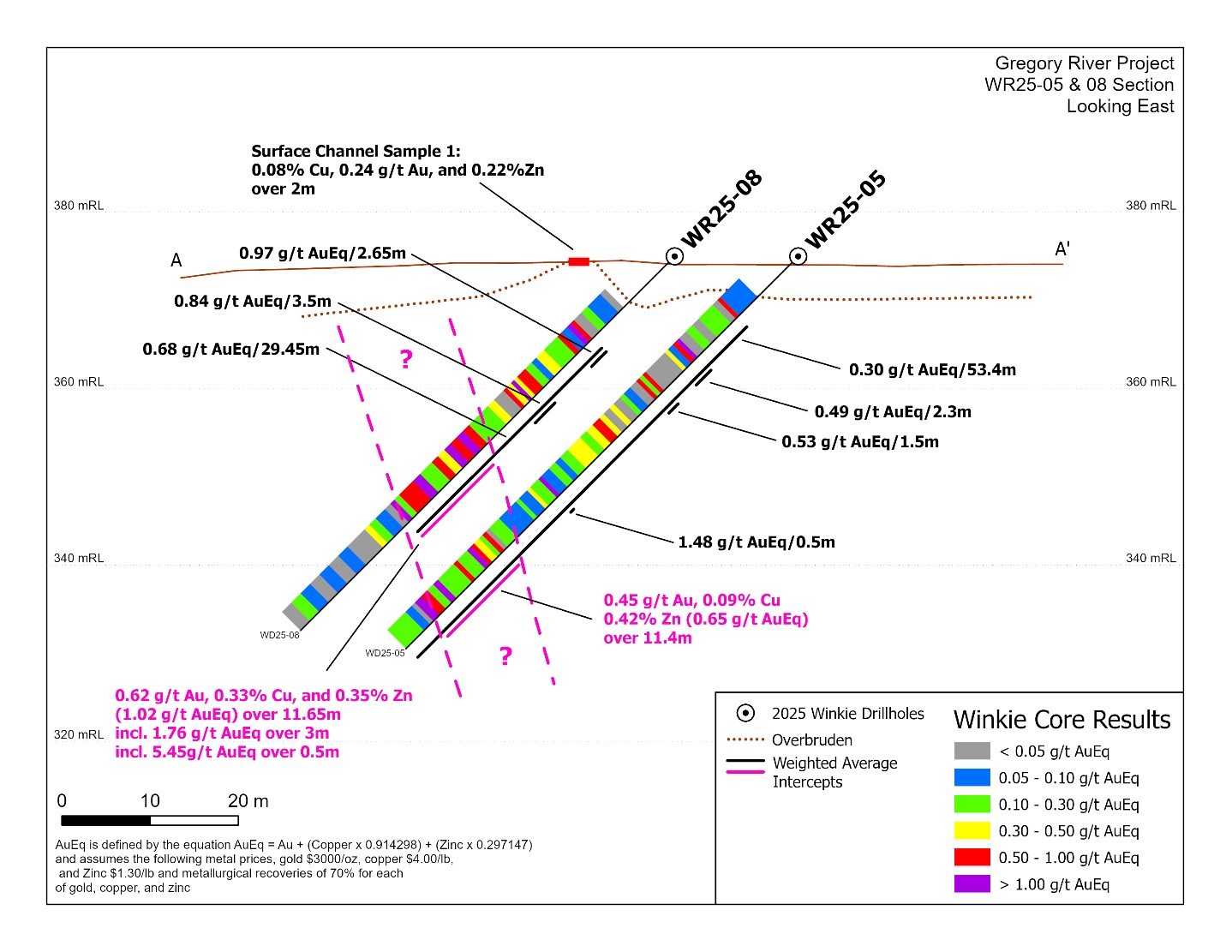 Figure 3 – Cross Section A-A’ showing Drill Holes WR25-05 and 08