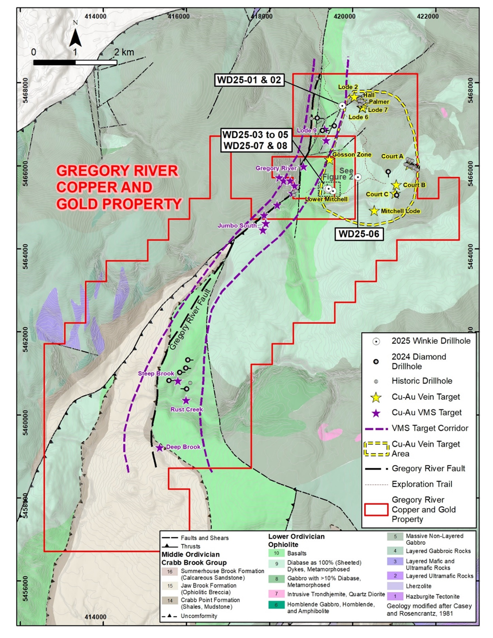 The intersections from holes WD25-01 and 02 are significant since they validate the IP anomaly and ground truth the historical copper soil anomalies that resulted from the 1991 Noranda survey. More importantly, they reveal a new zone of stratabound and/or stockwork copper (+/- gold) mineralization approximately 750 m to the northeast of the main Lode 9 zone that was drilled during 2024.